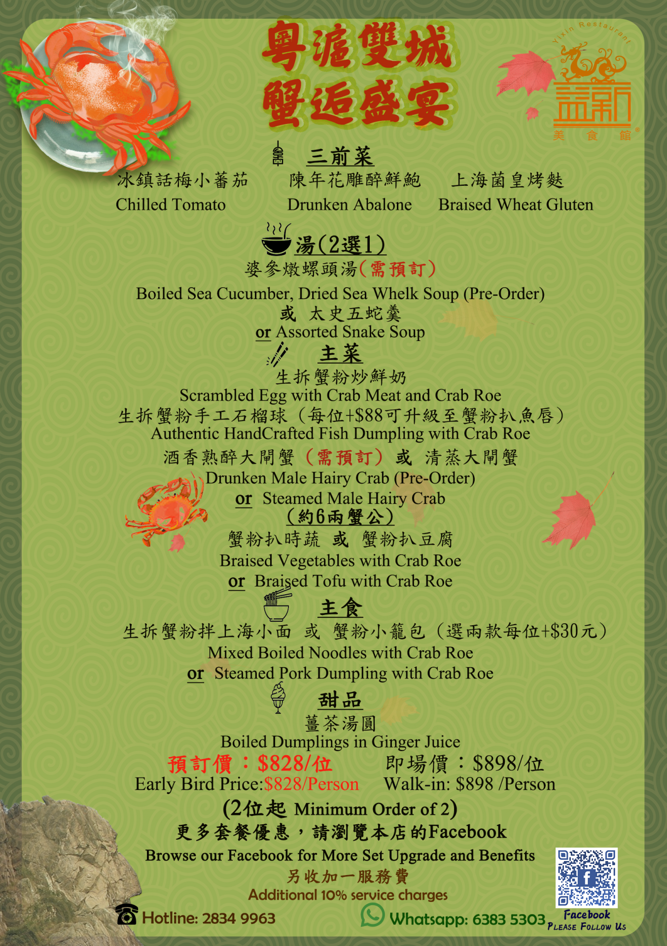 Yixin Restaurant has a feast of the hairy crab. This Year, we are not simply offering authentic, traditional signature dishes; we are also offering a crossover menu that appeals to our audience. We offer a variety of options for guests, including hairy crab dishes, soups, and main courses. Customers who choose the set menu will enjoy upgrade options tailored to their budget. Sound interesting? Please pick up your phone and call us on 2834 9963!